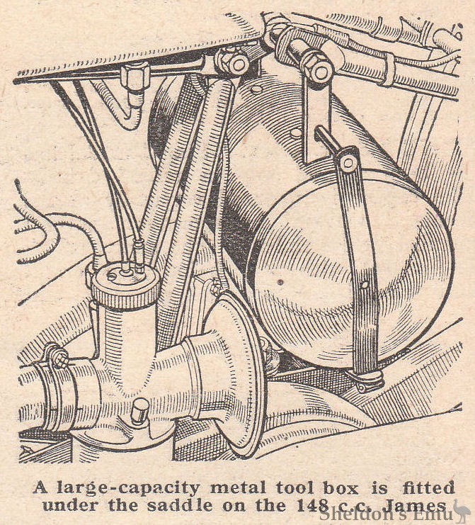 A large-capacity metal tool box is fitted under the saddle on the 148 c.c. James.