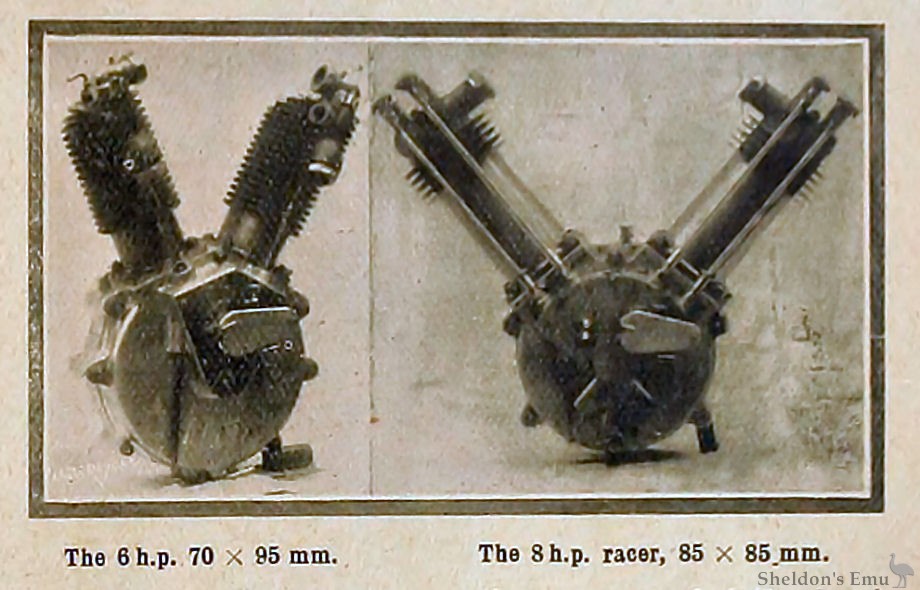 Next comes the 8 h.p. twin racing engine, each cylinder measuring 85 x 85 mm. This has mechanically operated inlet valves, and is the finest example of a light racing engine made. It will be noticed that the cylinders are mounted at an angle of 90 degrees to each other which, although improving the balance, presents a certain amount of difficulty in fitting to an ordinary roadster motor bicycle on account of the extra space required for the cylinders. The weight is 53 lbs., or with heavy flywheels 80 lbs. All of the above engines, with the exception of the racing type, can be supplied with water-cooled cylinders to order.