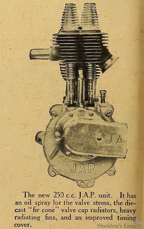 The new 250 c.c J.A.P. unit. It has an oil spray for the valve stems, the die-cast "fir cone" valve cap radiators, heavy radiating fins, and an improved timing cover.
