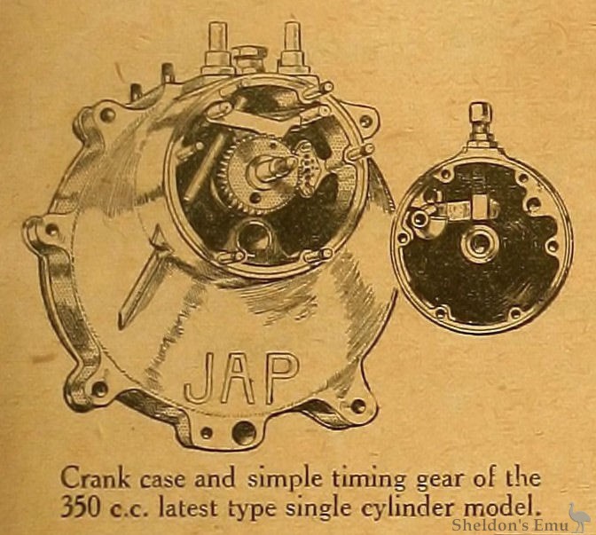 Crank case and simple timing gear of the 350 c.c. latest type single cylinder model.