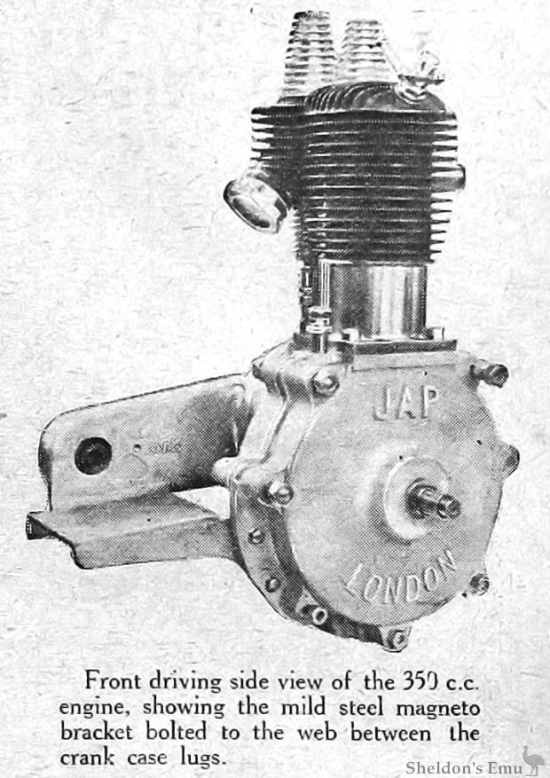 Front driving side view of the 350 c.c. engine, showing the mild steel magneto bracket bolted to the web between the crank case lugs.