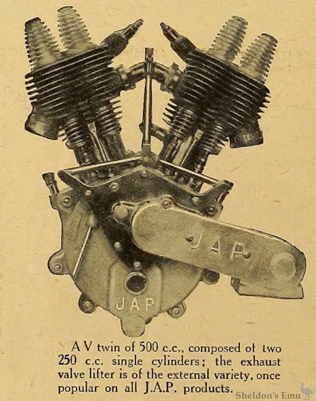 A V twin of 500 c.c, composed of two 250 c.c. single cylinders; the exhaust valve lifter is of the external variety, once popular on all J.A.P. products.