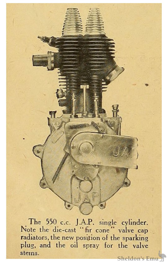 The 550 c.c. J.A.P. single cylinder. Note the die-cast "fir cone" valve cap. radiators, the new position of the sparking plug, and the oil spray for the valve sterns.