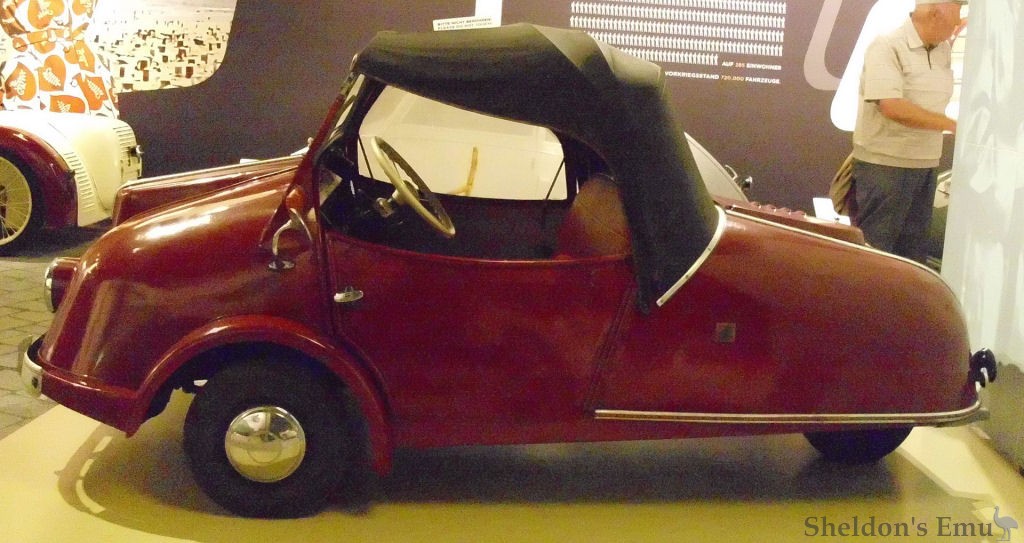Manufactured by Gustav Kroboth, whose history in the automotive sector dates back to the 1920s. After WWII he moved from Czechoslovakia to Bavaria where he salvaged military and aviation relics to build a variety of devices. His Allwetterroller was a three-wheeled microcar which was introduced at a 1954 motorcycle show. Powered by Sachs 175cc engines (optionally JLO 197cc), some 55 were produced before the factory closed in 1955. He also built a scooter, described on other pages (see menu).