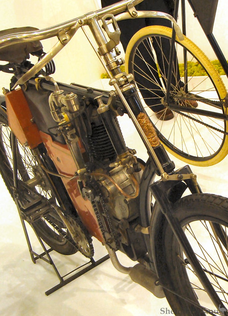 Front and rear brakes, both controlled by hand lever, were optional and set the machine ahead of the pack in the early 20th century.