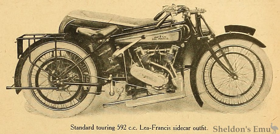 To the most critical, the Lea-Francis models are a joy. This firm has always had a reputation for the highest class of workmanship and the most refined productions. Two models only are at present shown, both with V twin M.A.G. engines, which differ only in the matter of the stroke, the larger model having a bore and stroke of 64x92 mm., whereas the stroke in the case of the smaller machine is only 77 mm. (496 c.c). These machines have always been noted for quiet running, and the bigger model, which perhaps attracts the most interest on the stand, is fitted with an aluminium silencer of ample dimensions.