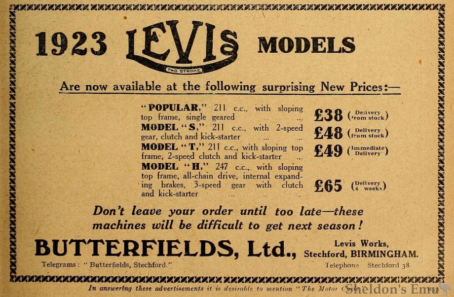 1928 onward. Levis produced 247cc (67mm bore x 70mm stroke) and 346cc (70mm