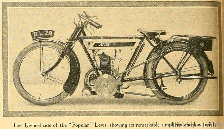We feel sure that the Popular model will prove fully equal to its name, for it is a most fascinating little mount. If we have a grumble it is at the size of the saddle, but one cannot expect a luxurious pan seat at the price, and for anything except long touring it is amply large enough. There is no doubt that a machine of this type will open up the delights of the open road to a vast number of potential riders, who have hitherto been debarred by questions of price or frightened by the supposed complications of the larger and more luxurious machines. And many users of heavy high-powered machines would find in the little Levis an excellent tender to their more ambitious machine which would be invaluable for short runs to and from business or to the golf links, or for a variety of other purposes, which will readily occur to the mind, just as the owner of a large car finds utility and pleasure in the employment of a little car to supplement and save its larger brother on many occasions.