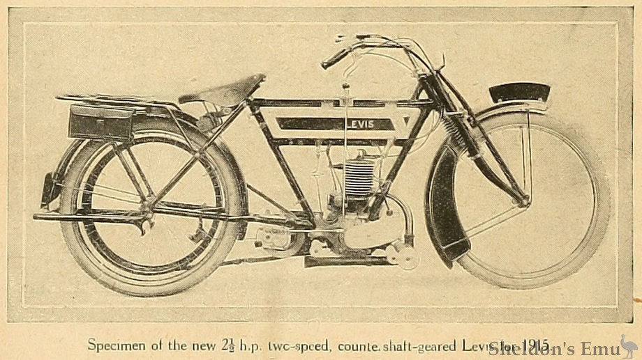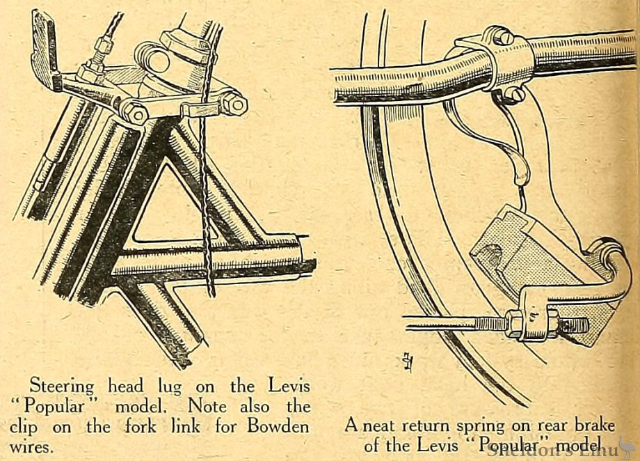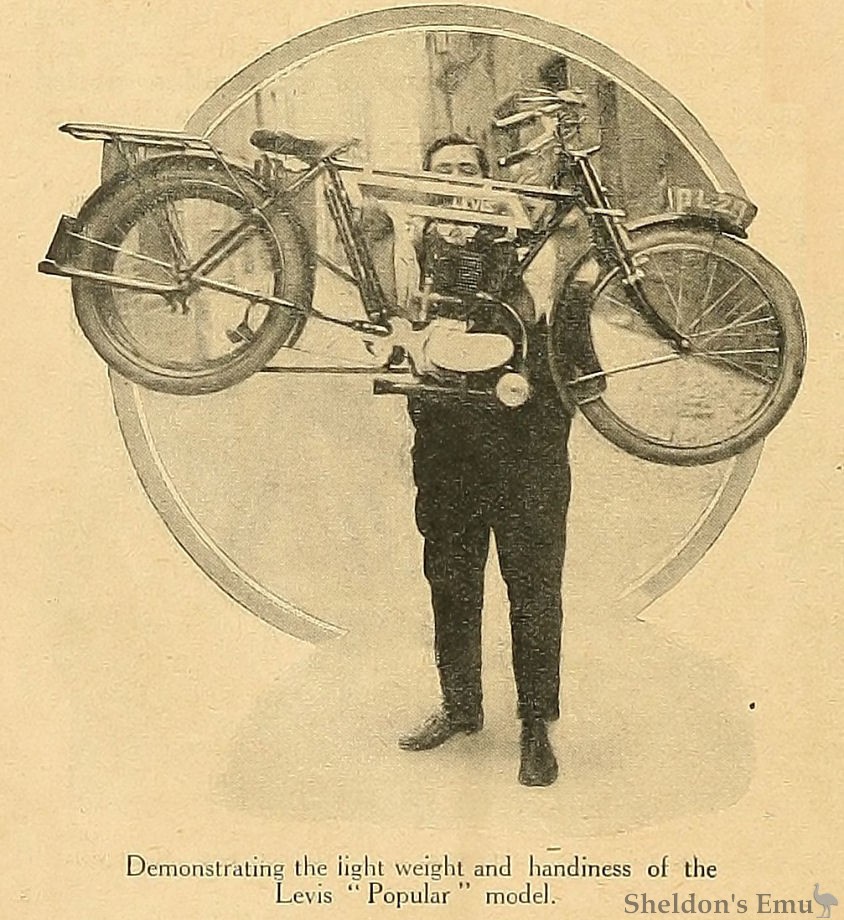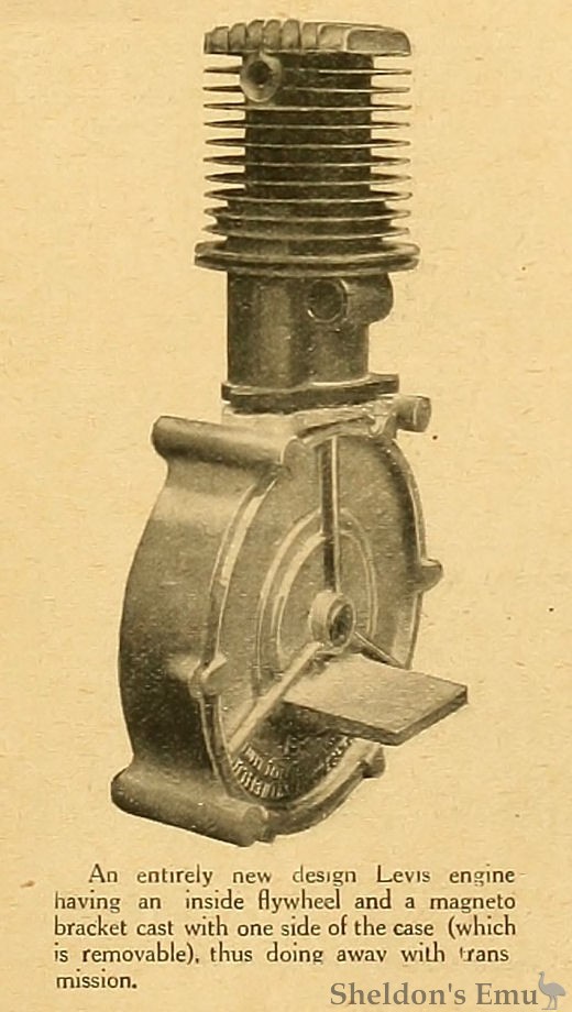 The cylinder has a bore and stroke of 60 X 70 mm. respectively, and the inlet pipe is cast integral with the cylinder, and lubrication is by drip feed to a cast ring round the cylinder base, which, it is not generally known, forms the subject of an early Levis patent.