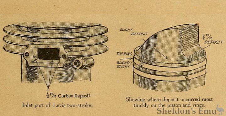 (L) Inlet port of Levis two-stroke (R) Showing where deposit occurred most thickly on the piston and rings.