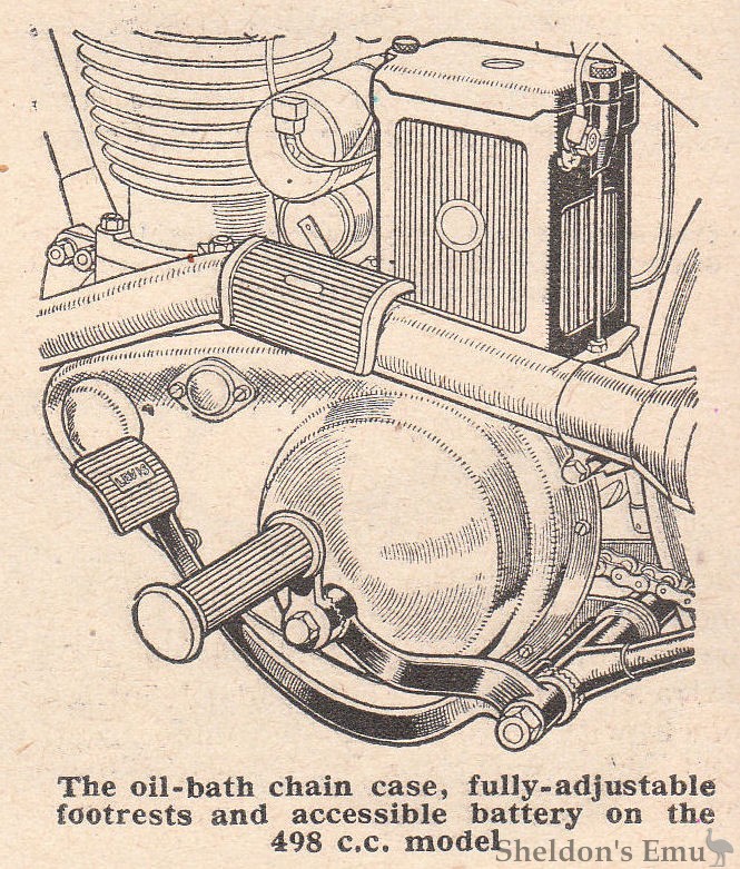 The oil-bath chain case, fully-adjustable footrests and accessible battery on the 498 c.c. model.