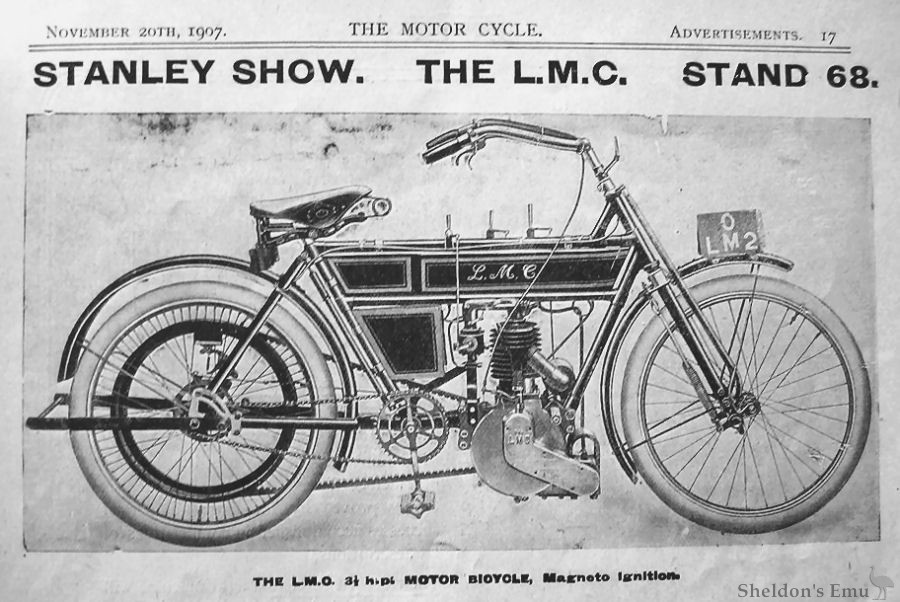 The L.M.C. motor bicycle is one of the finest examples of the British-made touring machine, three in all being shown. The engine is a 3½ h.p., with bore and stroke of 81 x 88. Magneto ignition is fitted as a standard, which is a point well worth consideration, and the magneto drive is carried out in a particularly effective manner. The drive is by means of gear wheels, and alternate bronze and steel wheels are fitted, thus rendering the transmission perfectly silent. Every magneto is adjusted when received at the works, and is guaranteed to start the engine at the first turn of the pedals. The exhaust valve tappet is made reversible, so that if there is excessive wear on one side the tappet can be turned round and the unworn side used, thus prolonging the life of this important part of the engine.