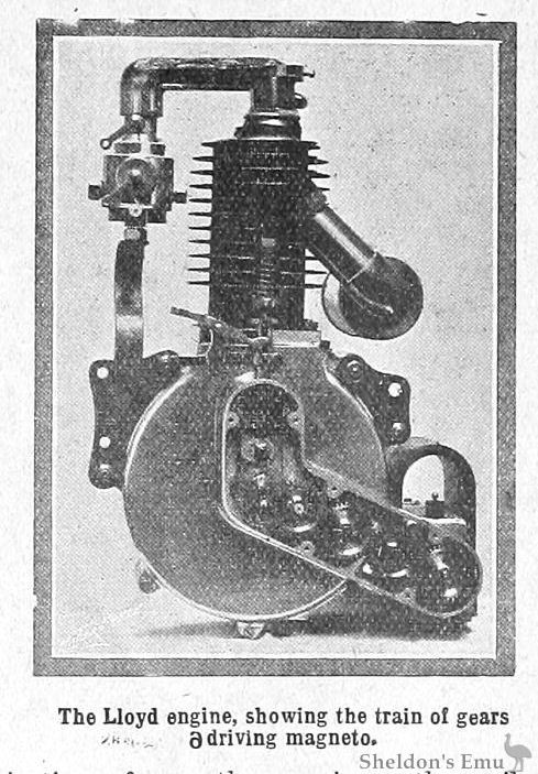 Another interesting point concerning the magneto transmission is that it is self-lubricating from the engine, the oil being delivered from the crank case into the magneto gear case. Every pinion is drilled with a hole running from a space between one of the teeth to the spindle, so that not only the teeth, but also the spindles are properly lubricated. Another interesting point is that every machine is fitted with a leather magneto cover. The levers are held in position by means of a spring pressing against two ... ones, so that it is practically impossible for them to work loose. No joints are made on the connecting rods to the control levers, these being hooked in position. The engine is of ample power, and most efficient, chiefly owing to a patent gudgeon pin, which Mr. Lloyd, the designer, has invented.