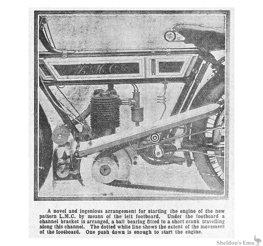 A novel and ingenious arrangement for starting the engine of the new pattern L.M.C. by means of the left footboard. Under the footboard a channel bracket is arranged, a ball bearing fitted to a short crank travelling along this channel. The dotted white line shows the extent of the movement of the footboard. One push down is enough to start the engine.
