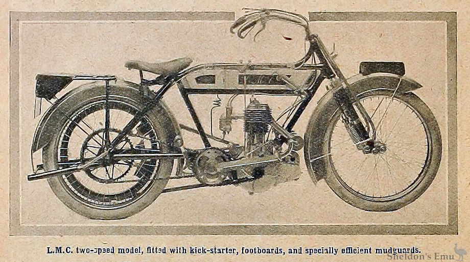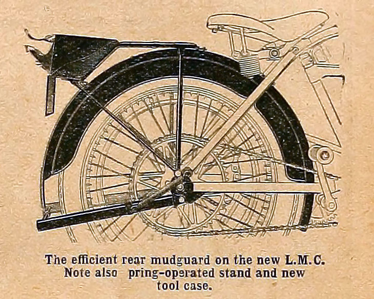 The model chosen for description made its first public appearance in the A.C.U. six days' trials, where it gained a gold medal. Most of the' features of the L.M.C. are still retained, that is to say, the engine is unaltered except for adjustable tappets. The silencer lies in front, and the rider's legs are protected from the exhaust gases by a neat cover. Sprung footboards are used, and the principle of the L.M.C. spring fork is retained; this, however, has undergone some improvement. In addition to previous descriptions, one other new feature of this engine consists of a decompressor which is operated by a small lever on the tank. This provides particularly easy starting and slow running. The L.M.C. two-speed gear was described in a recent issue, and it is only, necessary to remind our readers that the high gear is by belt direct and the low by chain. The front fork is now fitted with a special spring which takes both thrust and rebound strains, and is pivoted on plain bearings.