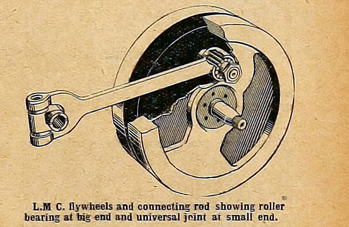 L.M.C. flywheels and connecting rod showing roller bearing at big end and universal joint at small end.