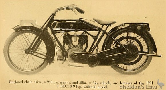 Enclosed chain drive, a 960 c.c. engine, and 28in. X 3in. wheels, are features of the 1921 L.M.C. 8-9 h.p. Colonial model.