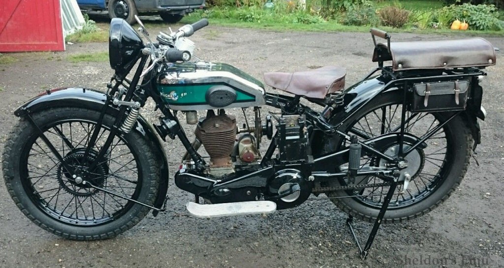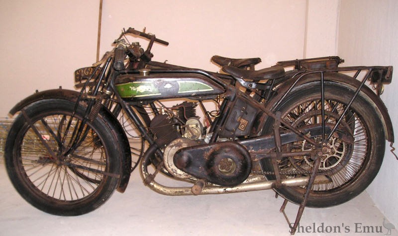 A flat twin engine embodying several novel features is carried in a cradle attached to an equally unusual frame. In the sump of the engine is a simple two-speed gear, and a cone clutch is mounted externally, the final drive being by belt. Opposed valves are employed, the exhaust being overhead, and a single tension spring working through rockers is utilised to return both inlet and exhaust valves. Mechanical lubrication is used.