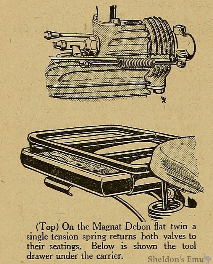 (Top) On the Magnat Debon flat twin a single tension spring returns both valves to their seatings. Below is shown the tool drawer under the carrier.