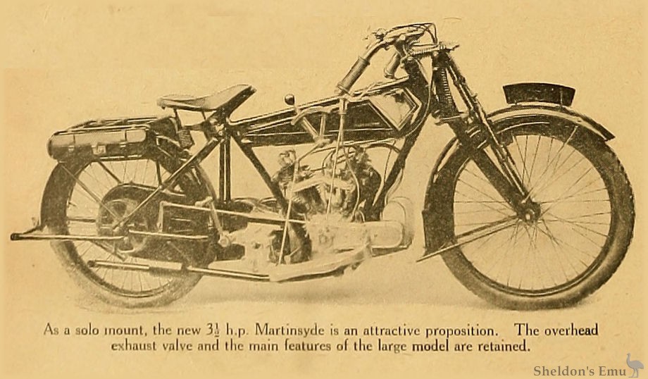 As a solo mount, the new 3½ h.p. Martinsyde is an attractive proposition. The overhead exhaust valve and the main features of the large model are retained.