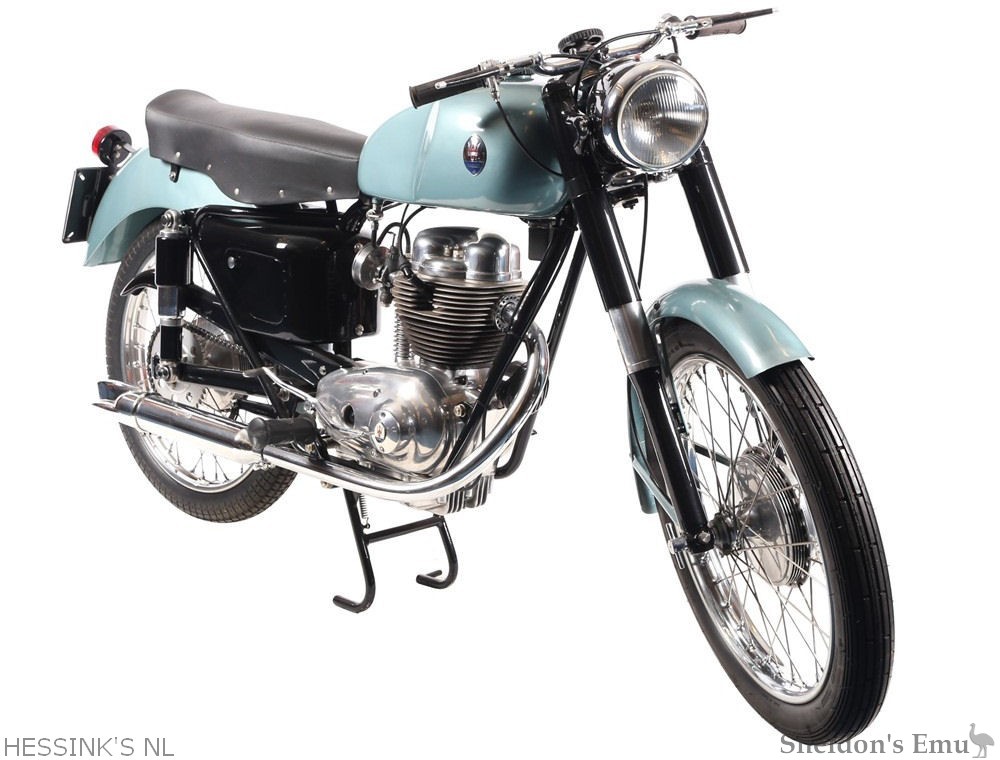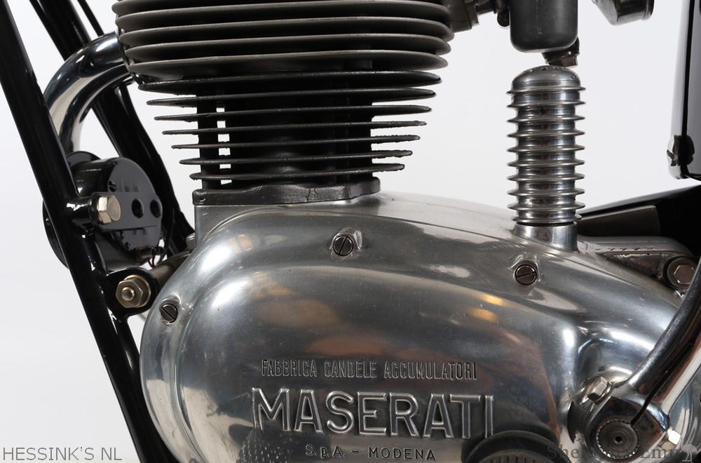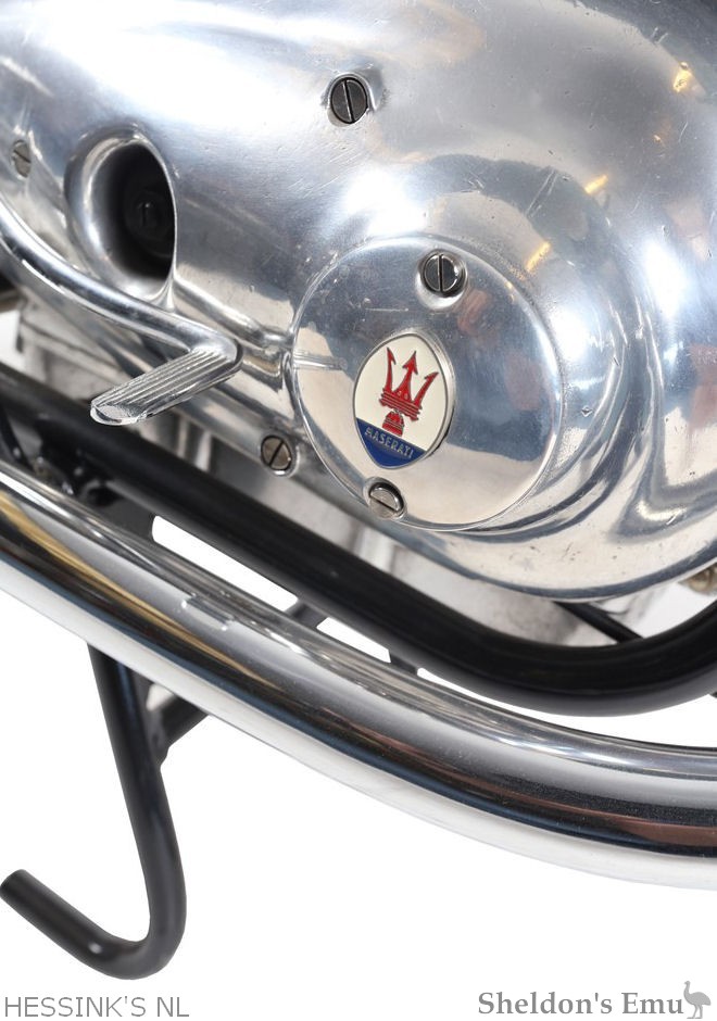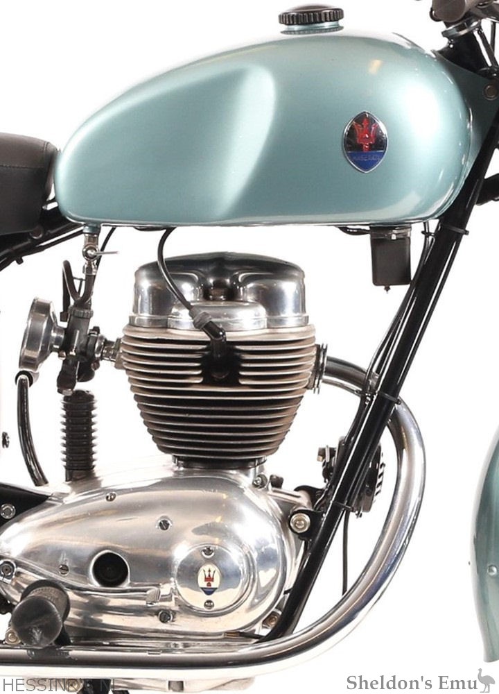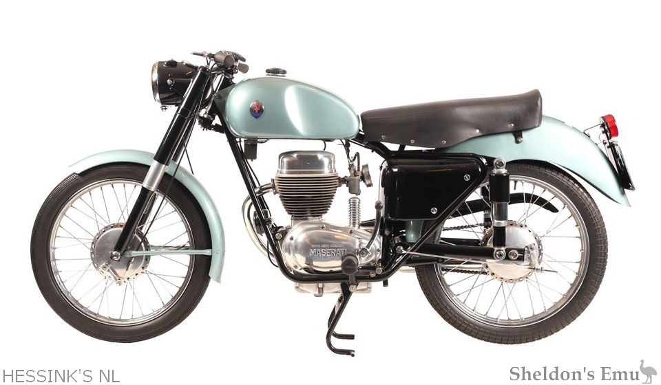 Idi Orsi of Maserati purchased Italmoto of Bologna in 1953, and began motorcycle manufacture in Modena under the Maserati banner. The first machine to bear the famed Trident badge was the 160cc Italmoto T4 160cc, a four-stroke 158cc single developing 7.5 bhp with a 4-speed transmission and teledraulic suspension. It weighed 110kg dry and had a top speed of around 100 km/h.