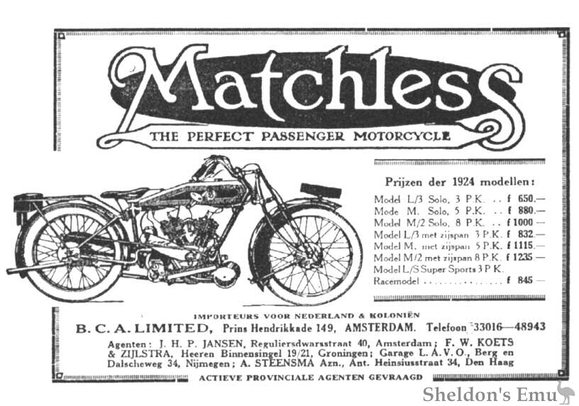 1937 The old V-twin engine was refreshed and was still used for sidecar models. The company sold the engine to at least five other manufacturers and also for the Morgan three-wheeler. Matchless purchased Sunbeam and formed the AMC group.