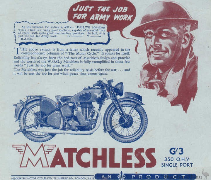1939 Matchless now had twelve models in their range and all but one twin were of the G-series. During World War II, Matchless made 80,000 G3 and G3L models for the armed forces.