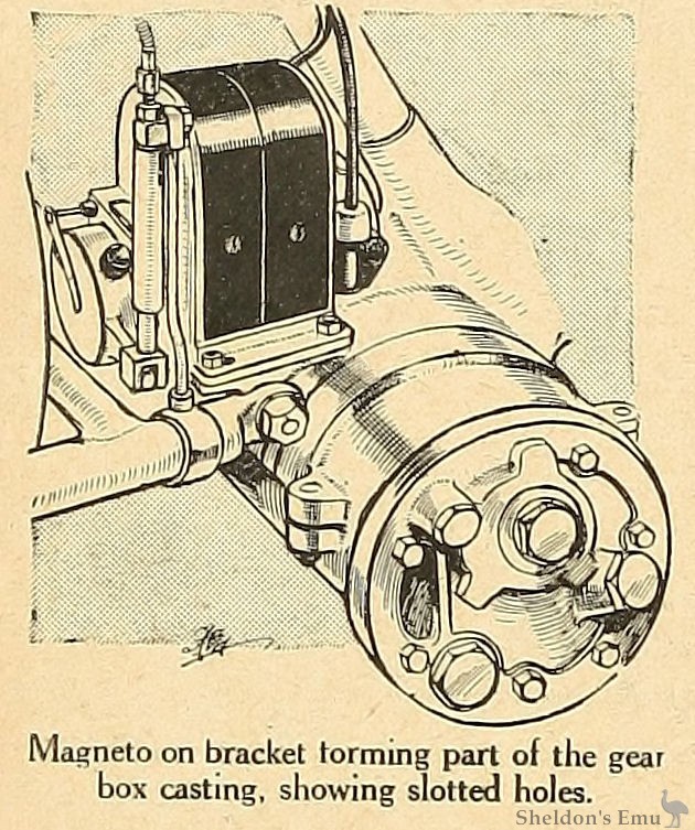 The magneto bracket forms part of the gear box casting, and the bolts holding the magneto on to the bracket pass through slotted holes so that in the event of it being necessary to take down the engine the magneto can be slid backwards, the tailshaft dropped out, and the engine removed without further disturbing the magneto. The magneto itself is in an ideal position, and is well out of the way of mud and wet.