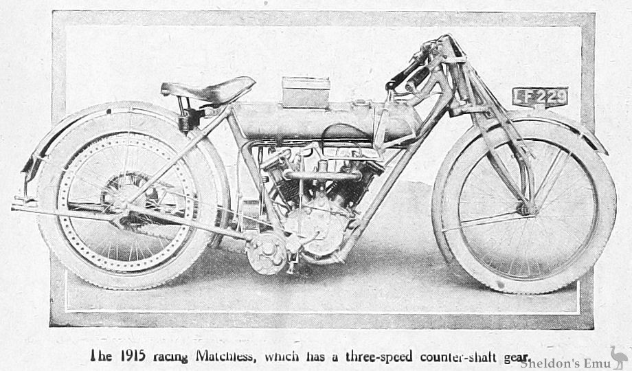 THERE are no men in the motor cycle business who have had greater experience in the use and construction of racing motor cycles than Messrs. H. A. and C. R. Collier. From the very earliest days of the movement we used to watch with interest the wonderful performances of these intrepid riders on Canning Town track, which was only banked for 40 m.p.h., but even in those early days they used easily to exceed the limit of speed on carefully built and well tuned 2¾ h.p. racing machines. It is not surprising, therefore, to note that the 1915 3½ h.p. Matchless racer is a beautiful piece of design, capable of obtaining the highest possible speeds, and of standing up under the most strenuous tests. The machine we are about to describe was primarily built for the 1915 Tourist Trophy.
