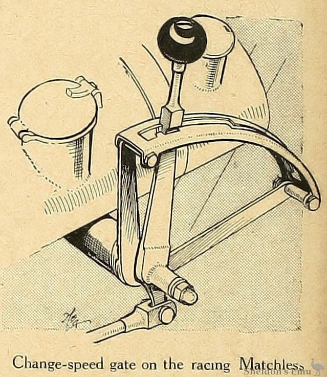 These planes are kept in engagement by means of a strong spring, but on the engine accelerating there is a tendency for the sprocket to force the sleeve on which the inclined planes are cut backwards and so give just the right amount of slip to absorb all sudden stresses on the chains. The bolt at the end of the mechanism acts as a grease cup, and if grease be injected it lubricates the device adequately for a season's running. A further shock absorber is fitted to the back sprocket which takes the form of a rubber cushioned drive, with the result that the transmission in the racing Matchless should be as elastic as if a belt were fitted.