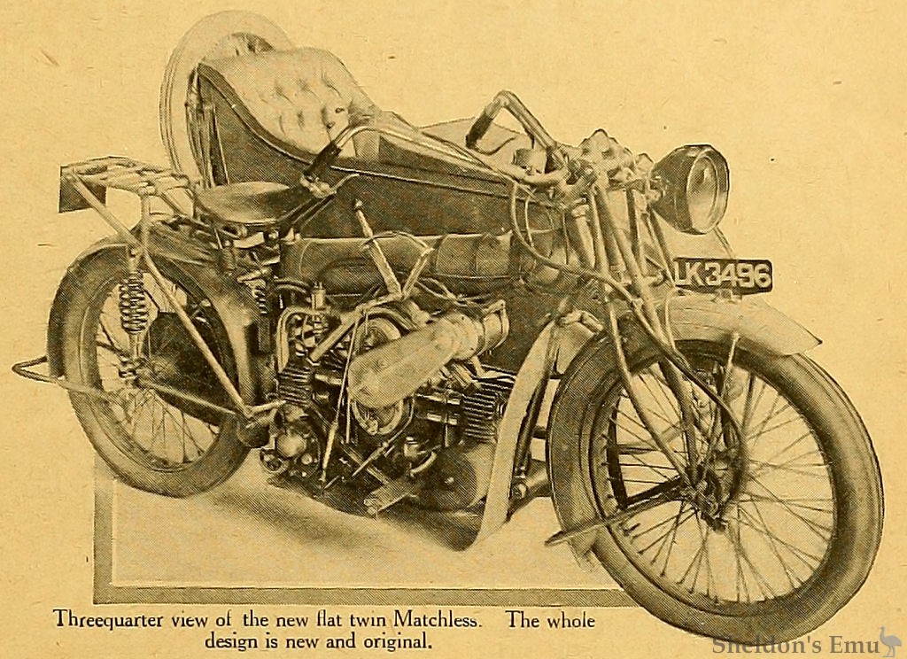 A fines de 1916 Matchless presenta el Modelo H especialmente adecuado para el uso con sidecar. Siguiendo la tendencia de los competidores de la época, el motor era un bicilíndrico “boxer” de válvulas laterales y 732 cc. (70 x 95 mm) colocado longitudinalmente en el cuadro. Tenía un gran volante externo de 12”, los cilindros podían ser removidos sin tener que sacar el motor del cuadro y los pistones eran de aluminio, algo avanzado para esos años.