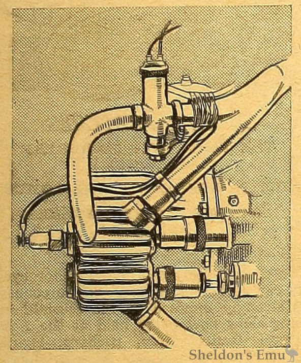 The design of the exhaust pipes is also worthy of note, the pipe from the rear cylinder entering the bottom of the expansion chamber, while the exhaust gases from the front cylinder issue through a short pipe into the top of the expansion chamber, the final exit being through a long pipe on the near side of the machine.