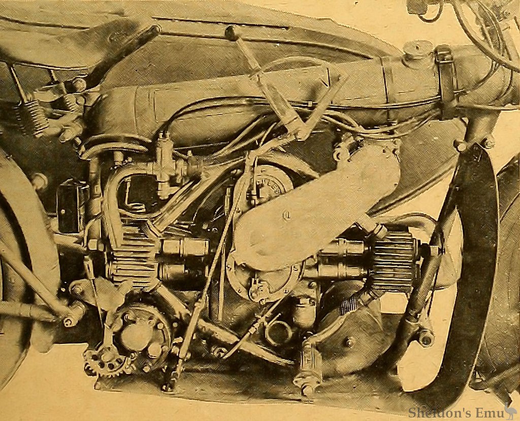 Although for many years they assembled their machines and bought their engines from outside firms, they were by no means ignorant of engine design, and considerably altered for the better many of the engines built up into their machines. Now, for the first time, they have designed their own motor, and a very successful production it is. Being absolutely up-to-date in their ideas, they have evolved a 5-6 h.p. flat twin embodying the very latest practice in motor cycle engine design. Furthermore, being cognisant of the magnificent future for British motor cycles in the Overseas Dominions, they have placed upon the market a well-tried and thoroughly efficient spring frame, while not only has the absence of vibration of the flat twin led them to adopt this form of design (??), but also the fact that the ground clearance is much greater than is possible in the case of the V type engine, the actual clearance being 5 1/2 in. This is a point which will be much appreciated by Overseas customers.