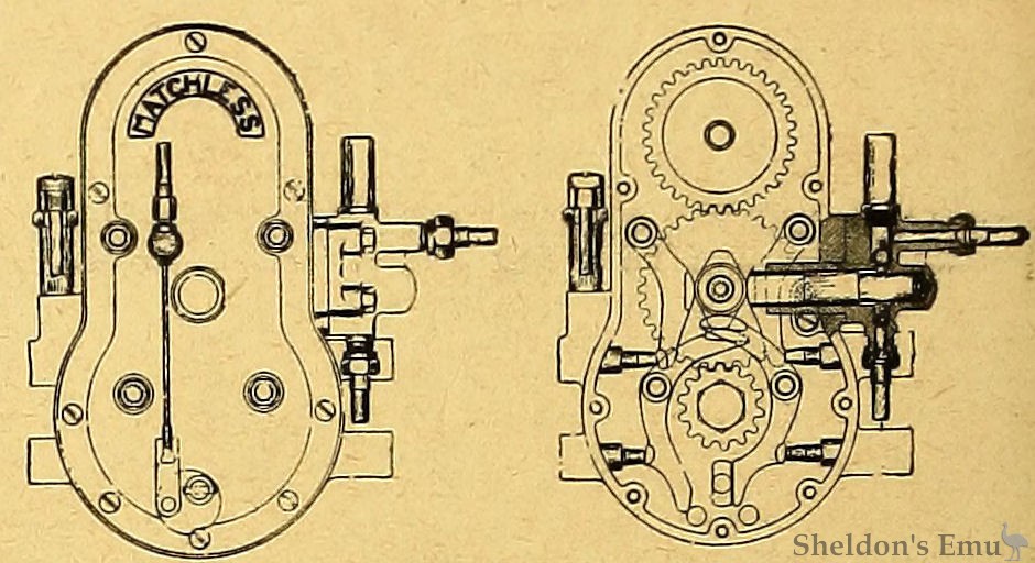 The question of accessibility has been carefully studied in the design of the new Matchless engine arrangement, which is so carried out that the cylinders may be removed without taking the engine out of the frame. The radiating fins run longitudinally down the cylinders and taper towards' their base. The cylinders are off-set to the amount of one inch. Both valves are horizontal and are arranged at the side in an accessible position, telescopic valve spring cams being employed which exclude all grit from the interior working parts of the valve system. Of the two portions of the valve spring cover the larger screws on to a ring surrounding the base of the tappet guide, and when it is found necessary to replace a valve it is unscrewed and slipped back, thus exposing the end of the valve stem and cotter. The valve gear is exceedingly simple and interesting, only three pinions being employed, while one set of cams actuates both inlet and exhaust valves.