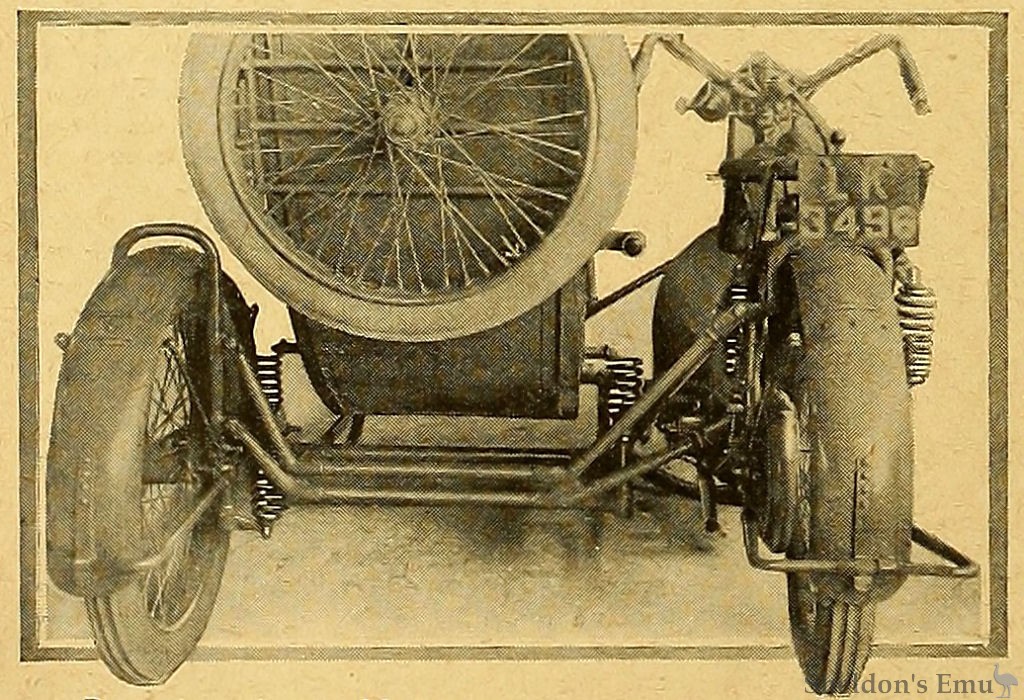 Rear view of the new Matchless sidecar combination, showing the duplex tube joining the sidecar and motor cycle, and causing the two sprung wheels to work in harmony.