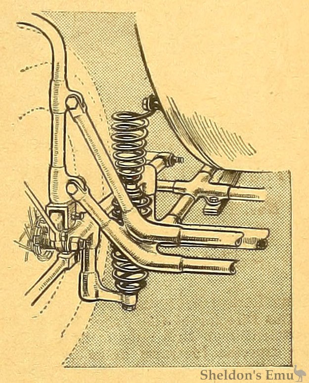The frame is a total departure from the firm's standard practice. In the first place, the tubular tank of steel, containing two gallons of petrol, forms the top member of the frame, and has a slight upward slope towards the head. The down tube forms a sort of, loop, and acts as a support for the engine. The spring forks have been somewhat improved in design, the lower pair of links being now inside the main members of the forks, which are wide enough to allow the mud-guard to form a perfect sweep from the front of the extension right down to the back.