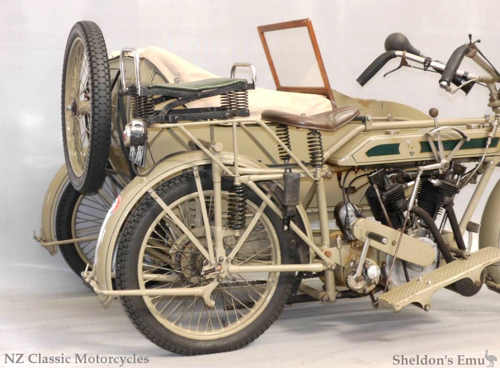 This example of the Model H is fitted with a Swiss MAG engine. The H and H2 were offered only as sidecar combinations, the sidecar being fully sprung and equipped with a spare wheel. The Model H was introduced in 1920 and was available with either a 980cc JAP or 996cc MAG engine, driving through a Matchless three-speed gearbox using hand change and foot clutch. The motorcycle was equipped with coil-spring cantilevered rear suspension.