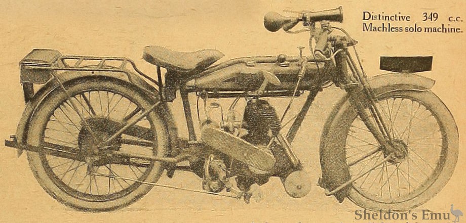 85.5x85 mm. (976 c.c.); twin cyl. four-stroke; side valves; drip feed lubrication : B. and B. carb.; chain-driven mag.; 3-sp. gear; clutch and kick-starter; chain drive; 26x3in. tyres. Price: Solo, £115.