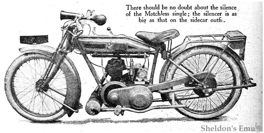 Small improvements have been made in the sidecars, there now being side shields to the windscreens, while a spring catch is fitted to the scuttle dash. Prices of 1923 Matchless machines range from £110, 976 c.c. J.A.P. or M.A.G. solo to the luxurious model H with two-seated sidecar and J.A.P. or M.A.G. engine at £160 10s.