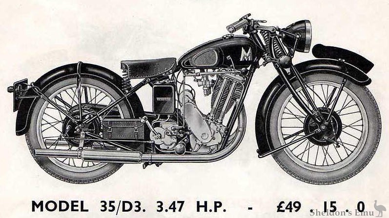 Model 35 D3 " DE LUXE " with chromium-edged mudguards and fitted with magdyno electric lighting with large head-lamp, electric horn, speedometer, oil indicator, ignition switch and illuminated instrument panel above handlebars ... When ordering this model please specify clearly whether high or low exhaust pipes are required.