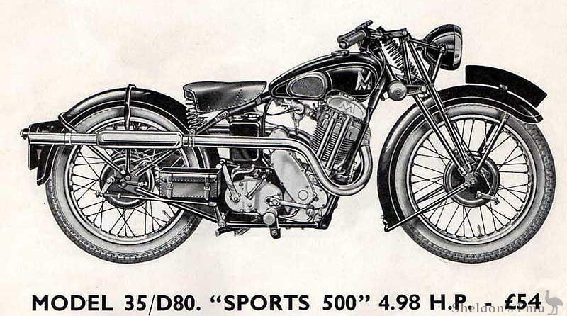 "Sports 500" Model 35/D80 "DE LUXE," with chromium-edged mudguards and fitted with Magdyno electric lighting wish large headlamp. electric horn, speeds meter, oil indicator and illuminated instrument panel above handlebars