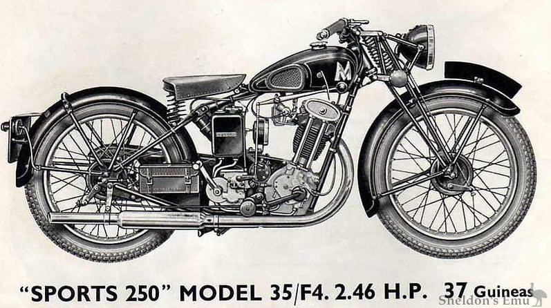 "Sports 250" Model 35/F4 "DE LUXE," with electric lighting, electric horn, gearbox-drive non-trip speedometer, chromium-edged mudguards and front stand 40 Guineas When ordering this model please specify clearly whether high or low exhaust pipes are required.