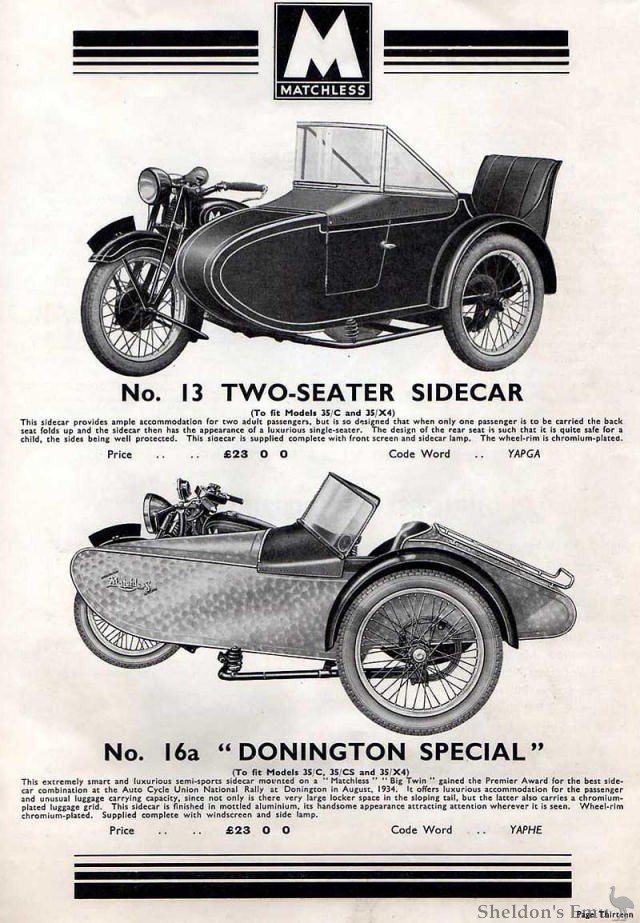 This extremely smart and luxurious semi-sports sidecar mounted on a " Matchless " " Big Twin " gained the Premier Award for the best sidecar combination at the Auto Cycle Union National Rally at Donington in August. 1934. It offers luxurious accommodation for the passenger and unusual luggage carrying capacity since not only is there very large locker space in the sloping tail but the latter also carries a chromium-plated luggage grid. This sidecar is finished in mottled aluminium. Its handsome appearance attracting attention wherever it is seen, Wheel-rim chromium-plated. Supplied complete with windscreen and side lamp.
