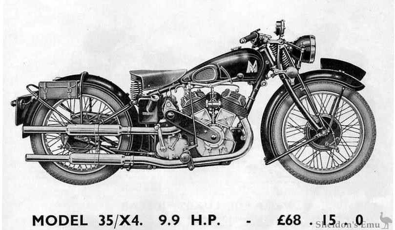 Model 35/X4 " DE LUXE," with Magdyno electric lighting with large headlamp, electric horn, speedometer, air filter, oil indicator and illuminated instrument panel above handlebars, and chromium-edged mudguards...
