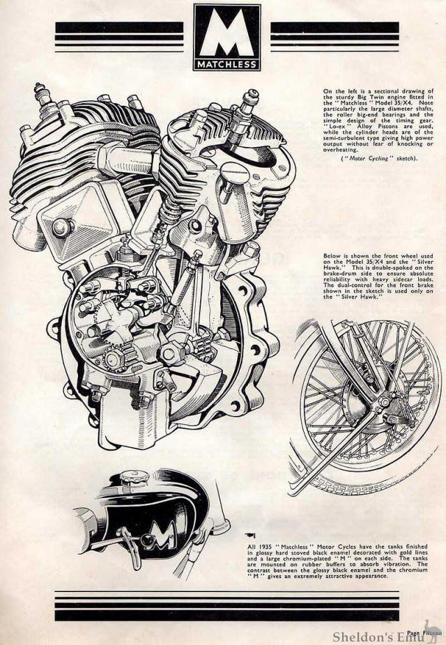 ... a sectional drawing of the sturdy Big Twin engine fitted in the " Matchless " Model 35/X4. Note particularly the large diameter shafts, the roller big-end bearings and the simple design of the timing gear, " Lo-ex 1* Alloy Pistons are used, while the cylinder heads are of the semi-turbulent type giving high power output without fear of knocking or overheating.