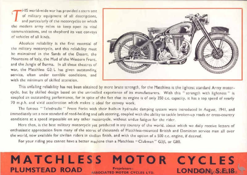 THE World famous Matchless "Clubman" Model reappears in Civillan form after six years' strenuous service with the forces in every theatre of war. First in France and Belgium in 1939, then to Egypt, Libya, Algeria, Morocco, Sicily, Italy, India, Burma, again into France, Belgium, Holland and Germany--in fact, everywhere where there was a real tough job of work to be done - there was the Matchless "Clubman" in Service rig-out. The first British Military Matchless was the well-known *350* "Clubman" Model G3, which was superseded in August, 1941, by the now famous Teledraulic equipped G3/L, a machine which has been lauded and praised by British and Allied Servicemen in every place and clime.