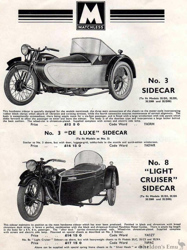 The firm manufactured its own sidecars between 1910 and 1937. The 1914/1915 7 h.p. twin was fitted with a sidecar with a "spring wheel":