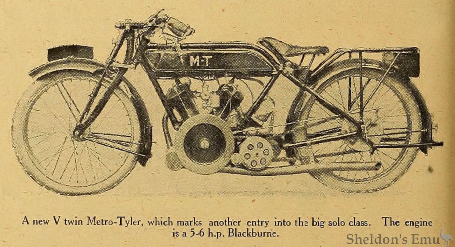 A new V twin Metro-Tyler, which marks another entry into the big solo class. The engine is a 5-6 h.p. Blackburne.
