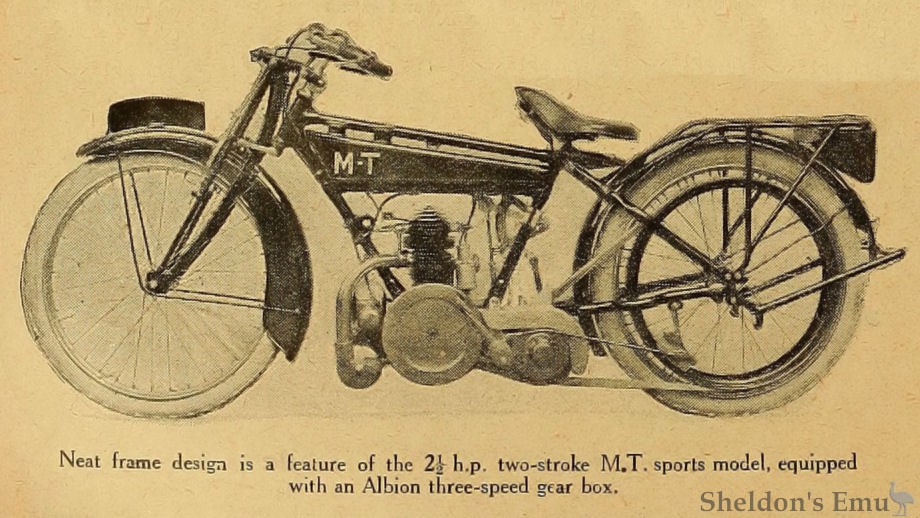 Neat frame design is a feature of the 2 ½ h.p. two-stroke M.T. sports model, equipped with an Albion three-speed gear box.
