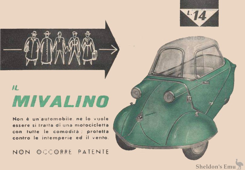 In 1954, Mi-Val began construction of the Mivalino, a three-wheeled Messerschmitt built under licence using a 171cc two-stroke engine.